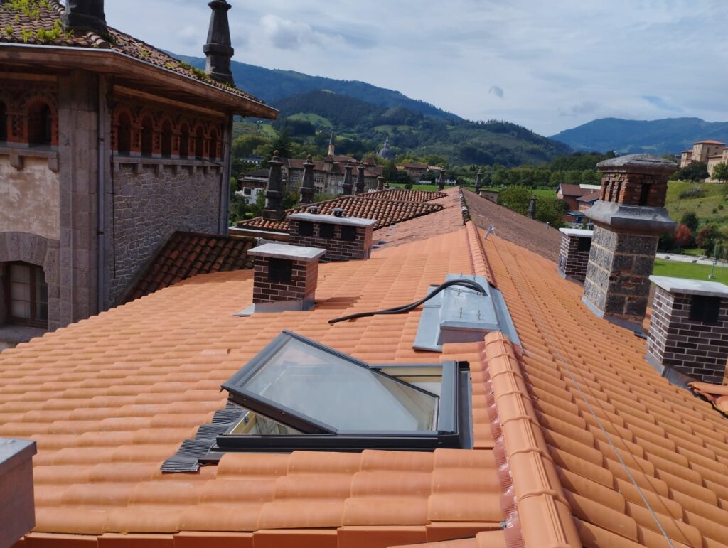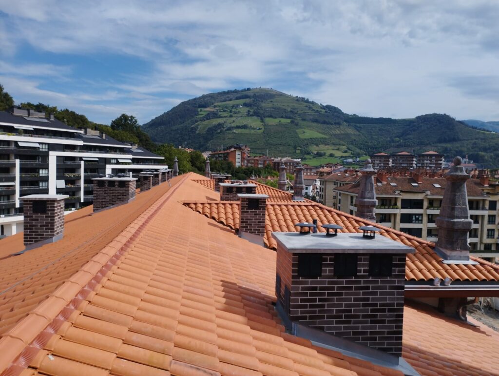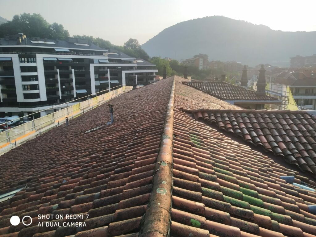 La rehabilitación de la cubierta inclinada consiste en un cambio de la teja existente por otra cerámica mixta sobre un soporte de placas asfálticas onduladas y un aislamiento rígido sobre la losa actual de hormigón. Incluyendo la instalación del sistema de evacuación de aguas pluviales de zinc (canalones, bajantes y accesorios) y colocación de remates de cubierta de zinc (bandeletas, limahoyas, baberos,…).